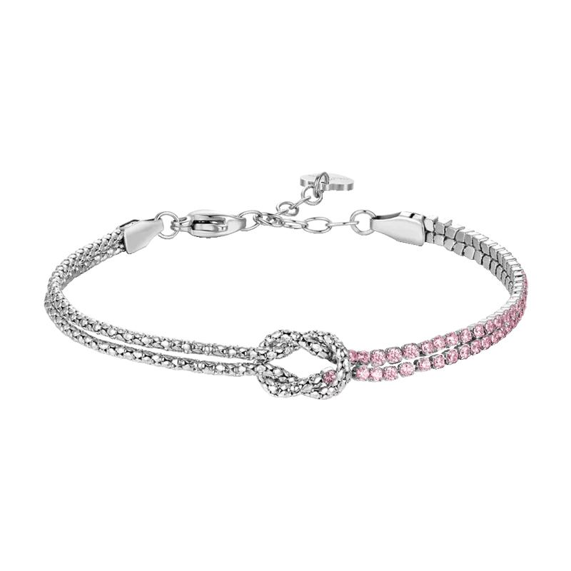 Il Bracciale Donna Luca Barra (BK2910) tinge di romanticismo la promessa di esserci sempre. Parte della collezione Legami, questo gioiello in acciaio arricchisce il simbolico nodo centrale con la luce delicata di zirconi rosa, perfetti per esprimere affetto e tenerezza.