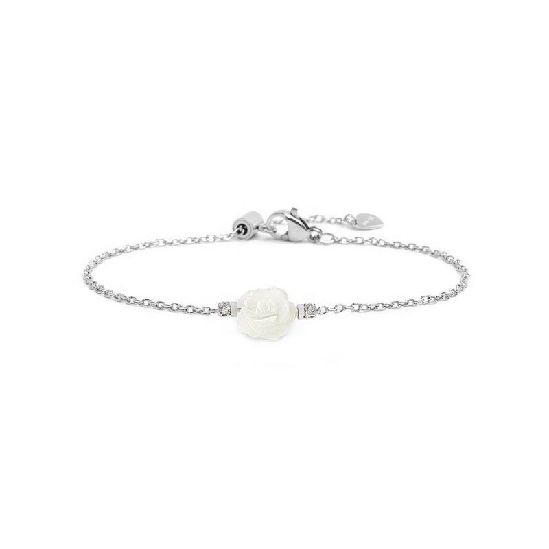 Il design presenta una sottile catena modello "cross" che sorregge l'elemento centrale: una delicata Rosa sagomata in Madreperla bianca, simbolo di purezza ed eleganza. La lucentezza della madreperla è esaltata da due Cubic Zirconia bianchi posti ai lati, che donano brillanti punti luce al polso. La chiusura è pratica e moderna: grazie al cursore scorrevole, la lunghezza è regolabile fino a 19 cm per una vestibilità su misura. Un dettaglio emozionale completa il gioiello: all'estremità della catena pende un tag a forma di cuore con inciso il logo Marlù sul fronte e la scritta "Nel mio" seguita da un cuoricino smaltato rosso sul retro, un dolce messaggio ("Nel mio cuore") da portare sempre con sé.