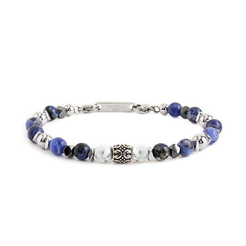 La protagonista cromatica è la pietra composita Blu Sodalite, le cui sfumature profonde evocano calma e sicurezza. Queste sfere si alternano ritmicamente a elementi in Ematite, proposta sia nella versione classica scura che in quella luminosa con finitura PVD Cromo, creando un sofisticato gioco di luci. A dare un tocco decisamente urban e grintoso è il cilindro centrale in acciaio con trama "black oil", una finitura vissuta che rompe gli schemi classici. La vestibilità è personalizzabile: puoi regolare la lunghezza da 21 cm a 19,2 cm rimuovendo il pratico tag logo Marlù in acciaio.