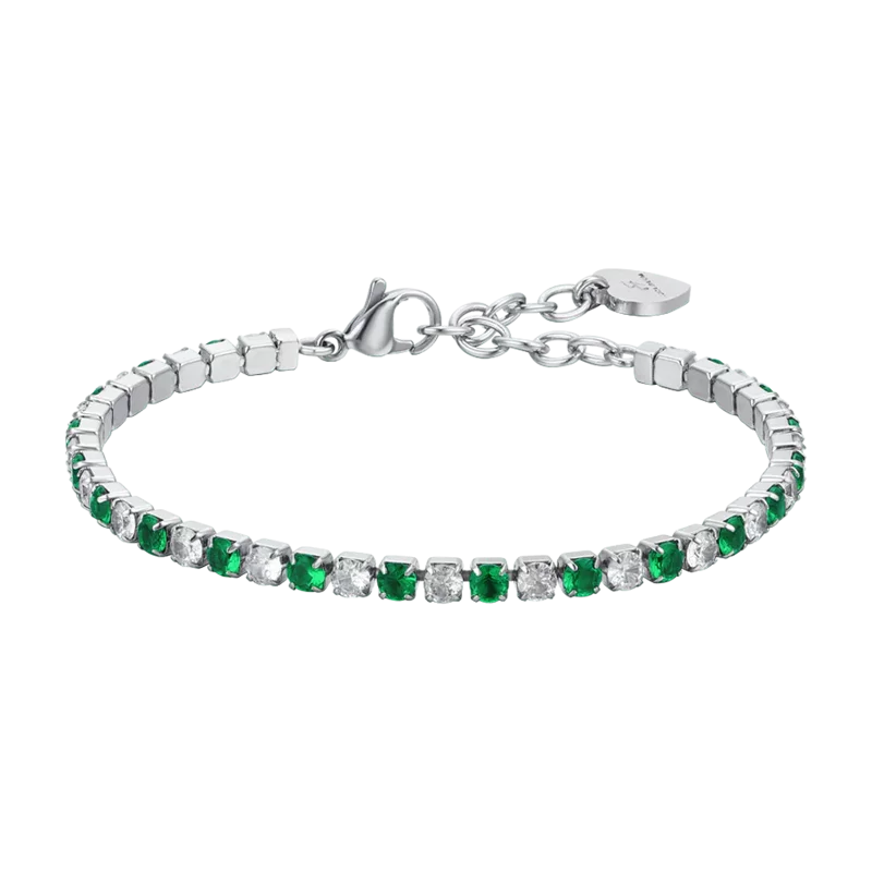Il Bracciale Tennis Donna Luca Barra (BK2633) porta al polso la freschezza della natura. Realizzato in acciaio, rivisita il classico design tennis alternando luminosi cristalli bianchi a vibranti cristalli verdi (3 mm), creando un gioco di luce sofisticato e unico.