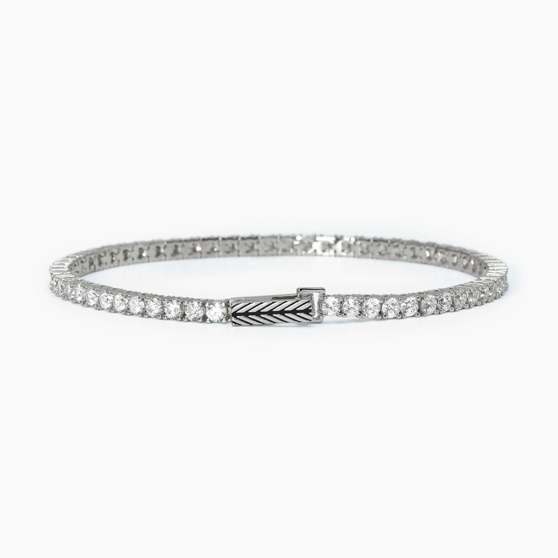 La brillantezza delle pietre è esaltata dall'incastonatura a griffe a quattro punte, che permette alla luce di penetrare da ogni angolazione. Il tocco distintivo di questo gioiello risiede nella chiusura a pinza: oltre a garantire la massima sicurezza, è rifinita con una texture spigata, un dettaglio di design che aggiunge carattere e modernità al bracciale. Con una lunghezza di 20 cm (misura Medium), veste comodamente il polso maschile, conferendo un'aura di eleganza disinvolta.