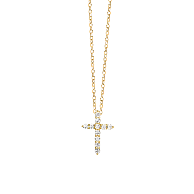 Questa collana è realizzata in resistente acciaio IP Gold e presenta una croce impreziosita da zirconi bianchi scintillanti (diametro 2 mm). L'acciaio IP Gold conferisce al gioiello una finitura dorata e una durabilità superiore. La croce ha dimensioni perfette (15 x 20 mm) e la catena, con uno spessore di 4 mm, ha una presenza decisa ma elegante. La lunghezza è regolabile (40 cm + 5 cm di estensione) per adattarsi a diversi stili.