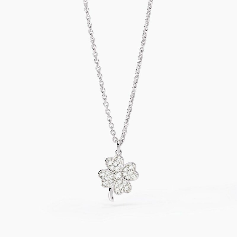 Girocollo regolabile da donna in argento rodiato con catena forzatina e pendente a forma di quadrifoglio con zirconi.