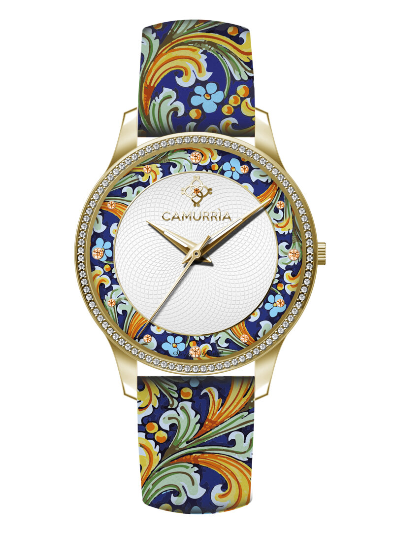 Orologio glamour con finiture gold dedicato alle ceramiche di "Caltagirone". Diventa protagonista di questo orologio con motivi ispirati alla Sicilia e ai suoi colori.